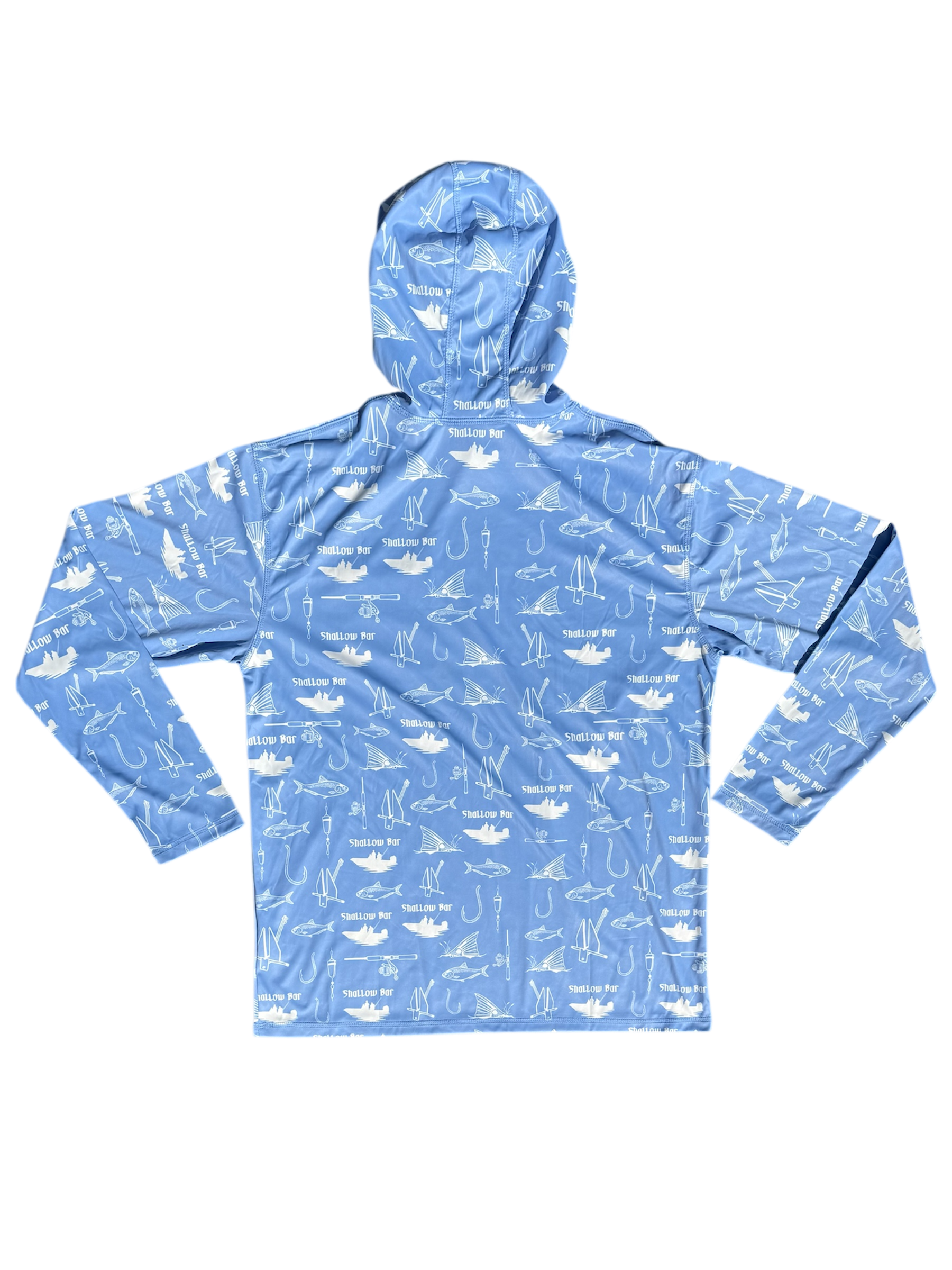 - Stay cool and protected on the water with the Shallow Bar Hooded Long Sleeve. Designed with anglers in mind, this lightweight performance long sleeve features an all-over print of the essential gear and fish that define the fall shallow-water fishing. Built for sun protection, breath ability, and all-day comfort, it’s the perfect piece for long days on the flats, the boat, or the dock.